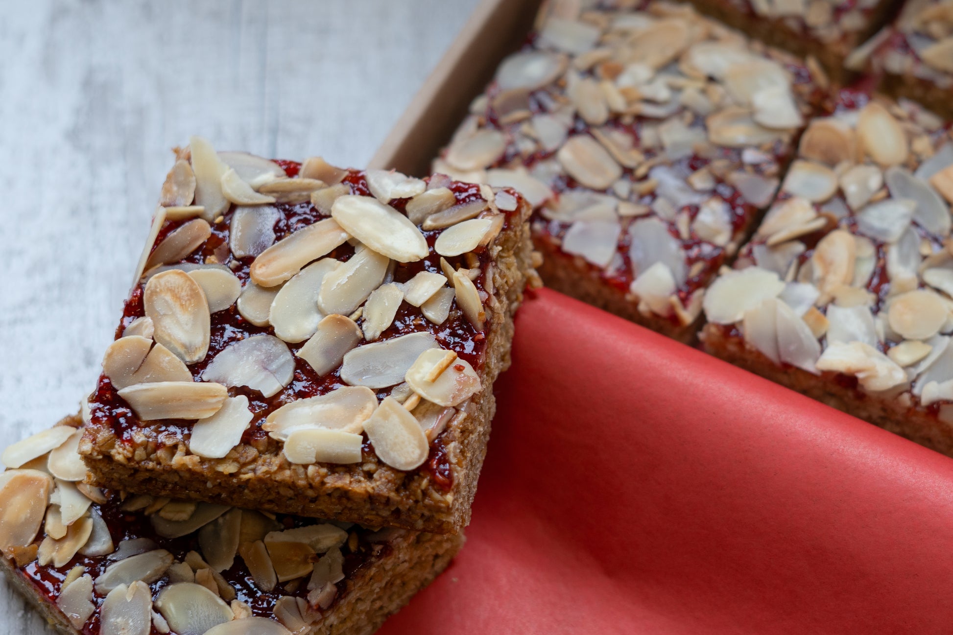 Fruity Raspberry Bakewell. Handcrafted in small batches, our Bakewell flapjacks are the perfect balance of chewy oats, almonds and topped with raspberry conserve and flaked almonds, beautifully packaged and ready to enjoy or gift.